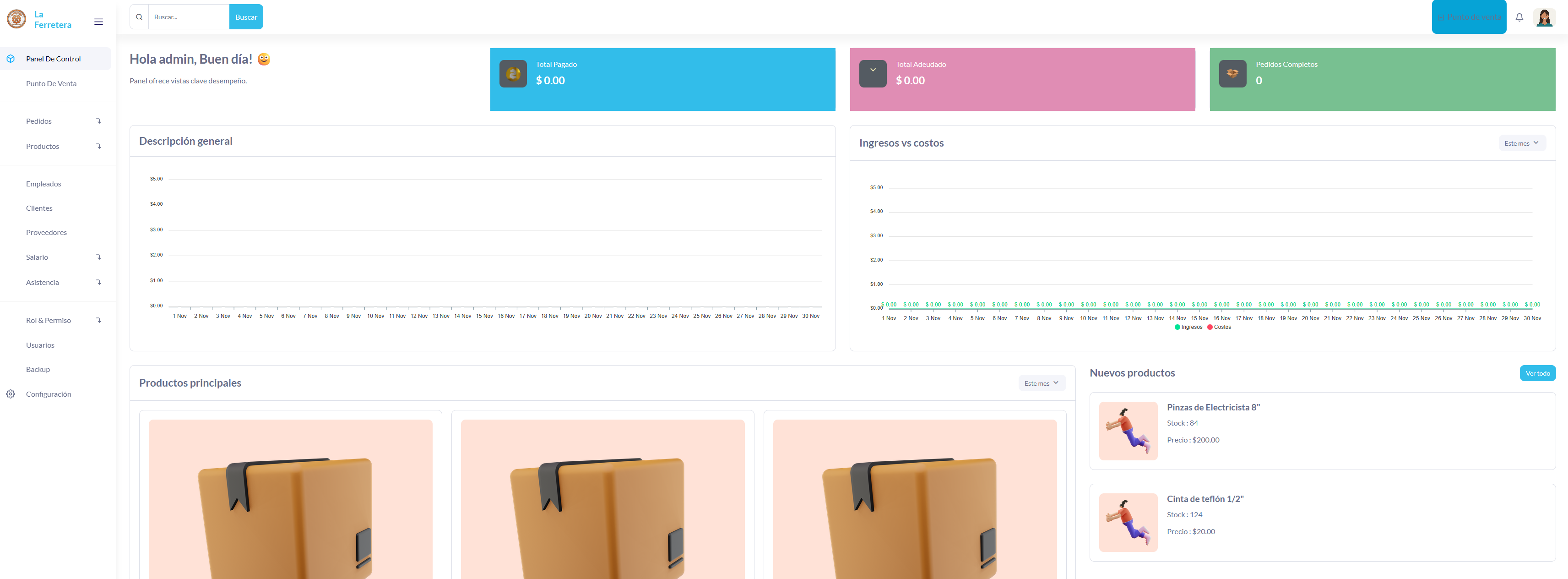 Control de inventario, lista inteligente de próximo pedido a proveedores, cobro por código de barras.